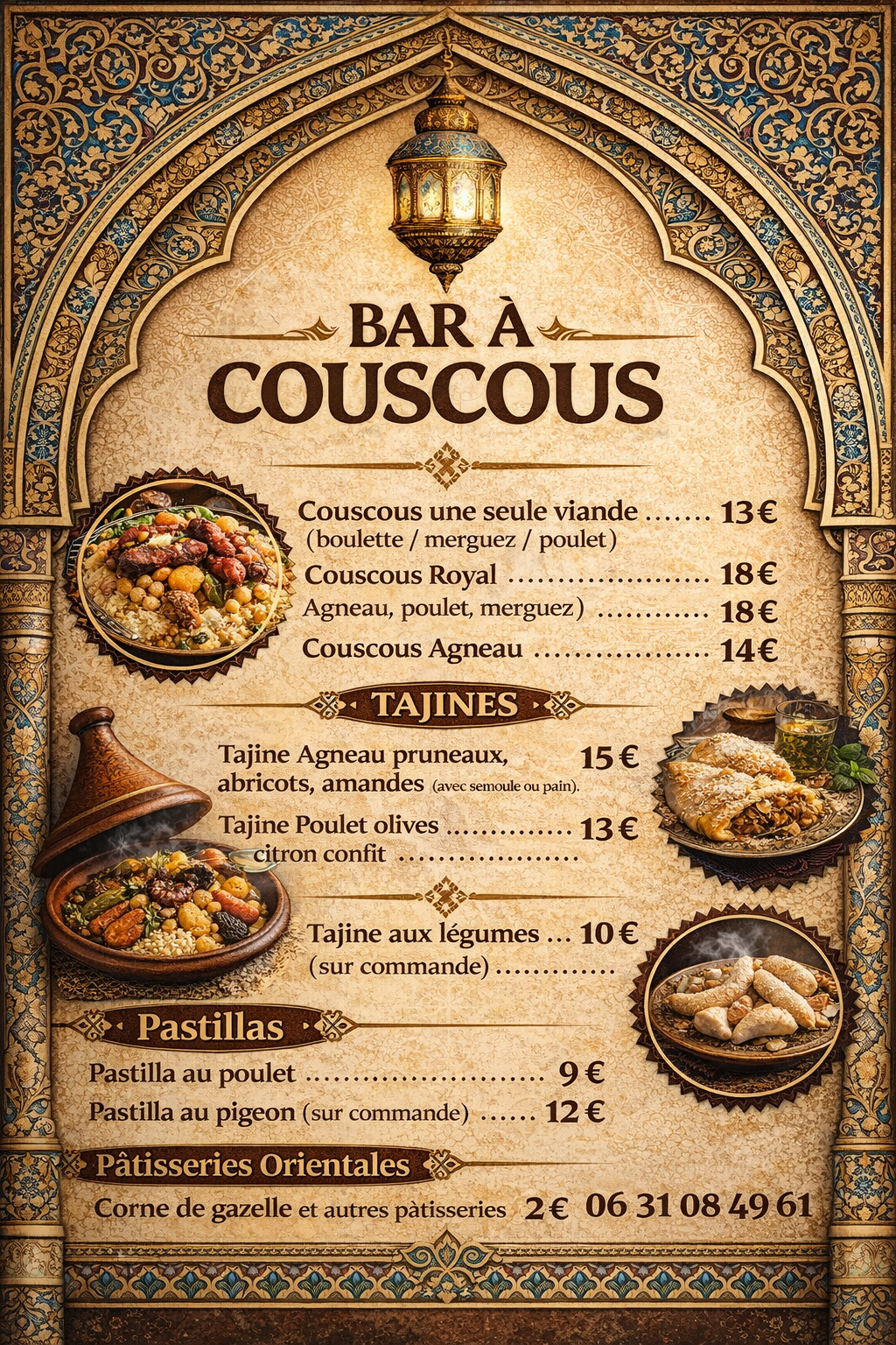 Plongez au cœur des traditions marocaines avec LE BAR A COUSCOUS. Nos plats sont préparés selon des recettes ancestrales, transmises de génération en génération. Nous utilisons uniquement des ingrédients frais, des épices authentiques et une cuisson lente pour vous garantir des saveurs riches et parfumées. Chaque couscous est une œuvre maison, avec une semoule légère, des légumes mijotés et des viandes tendres. Offrez à vos invités une expérience conviviale, généreuse et chaleureuse, fidèle à l'hospitalité marocaine.